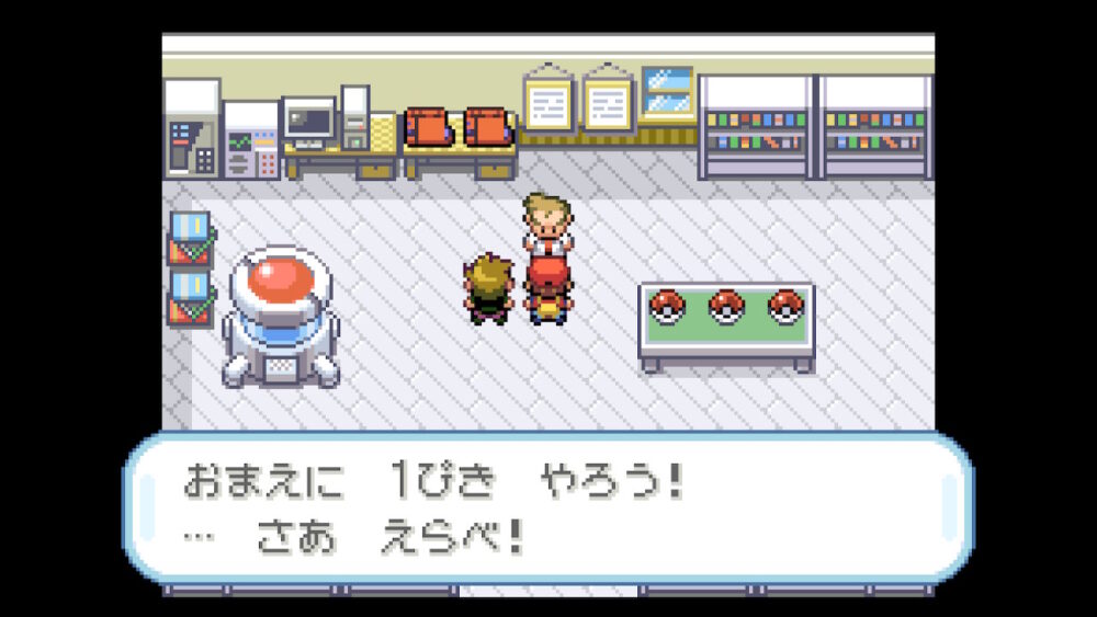 オーキド博士から『フシギダネ』『ゼニガメ』『ヒトカゲ』の中から、最初のポケモンをもらいます。