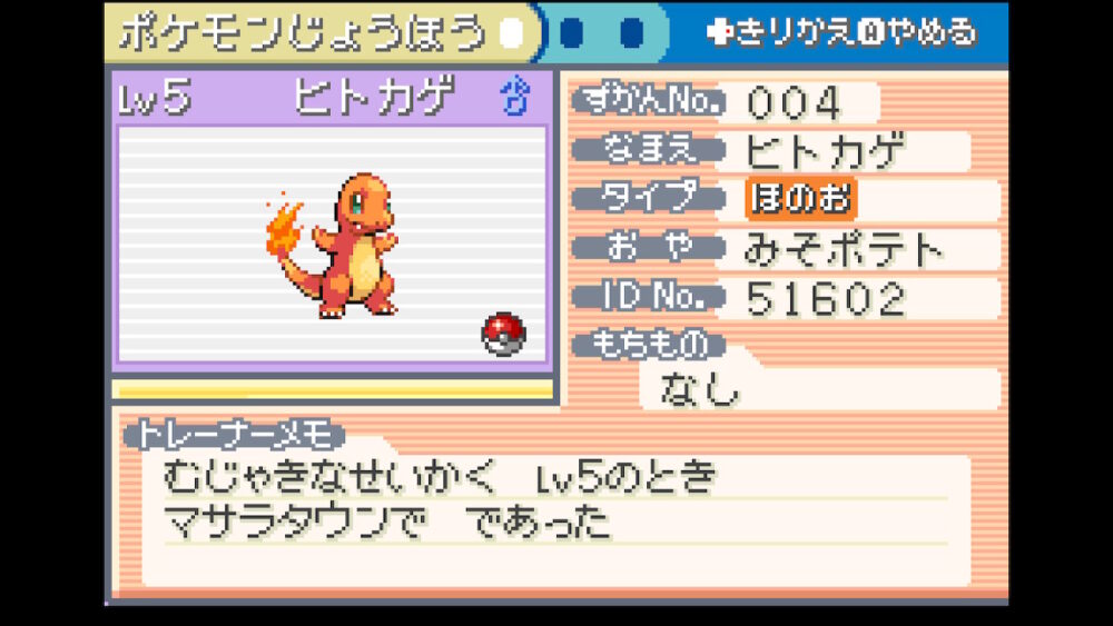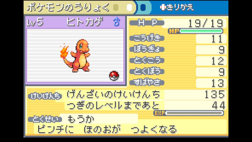 『ヒトカゲ』の初期パラメータです。特に厳選などはせずに選びました。