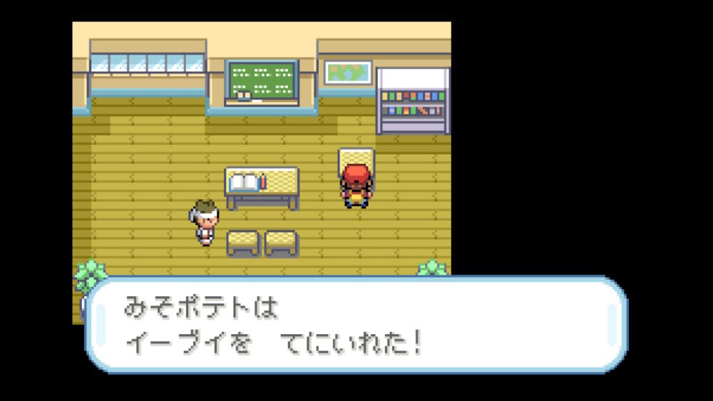 続いて、「タマムシマンション」を裏口から入る(ポケモンセンター横の細い道から行けます)と、屋上まで続く階段があり、屋上の小部屋内で「イーブイ」を手に入れることができます。