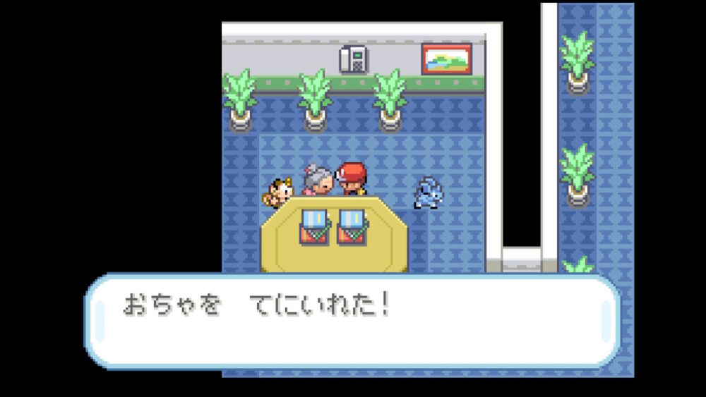 「タマムシマンション」に正面から入って、左側の部屋にいるおばあさんに話しかけると「おちゃ」をもらえます。これは隣町の「ヤマブキシティ」に行くのに必要なアイテムです。